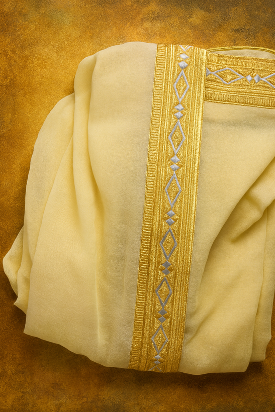 - گلدوزیهای هندسی با نخهای طلایی و نقرهای، در امتداد لبهها، یادآور هنر مضیف عربی و شکوه معماری اسلامی است—ترکیبی از سنت و تجمل.