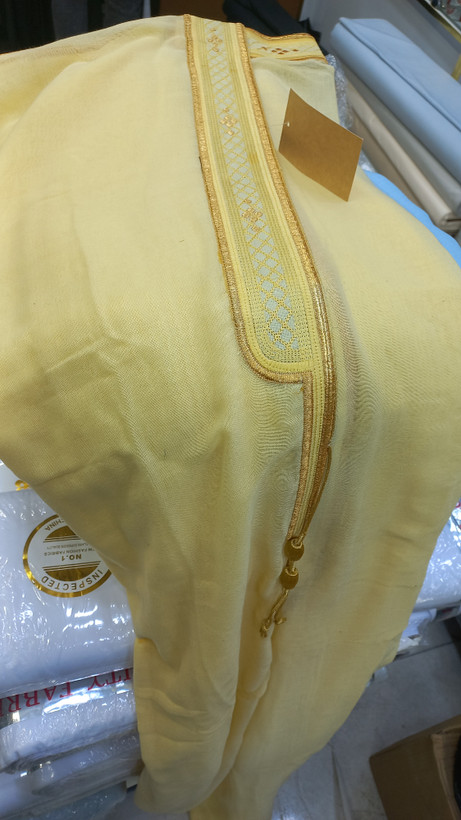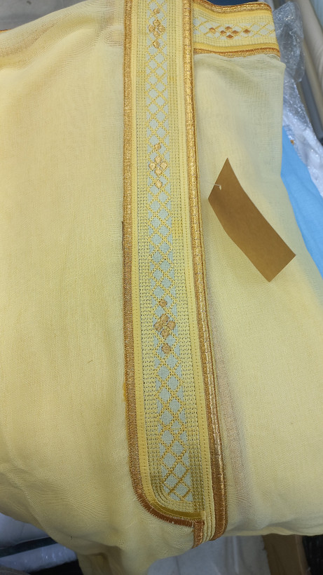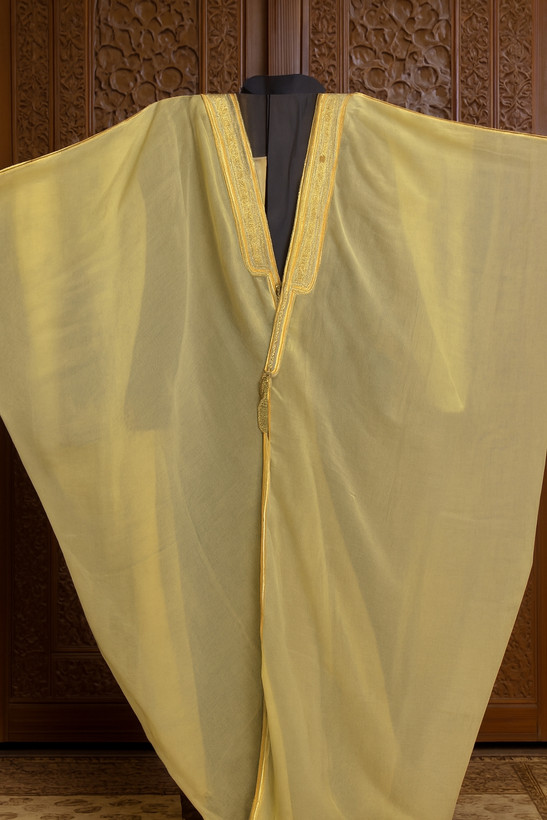 - گلدوزیهای هندسی با نخهای طلایی و نقرهای، در امتداد لبهها، یادآور هنر مضیف عربی و شکوه معماری اسلامی است—ترکیبی از سنت و تجمل.