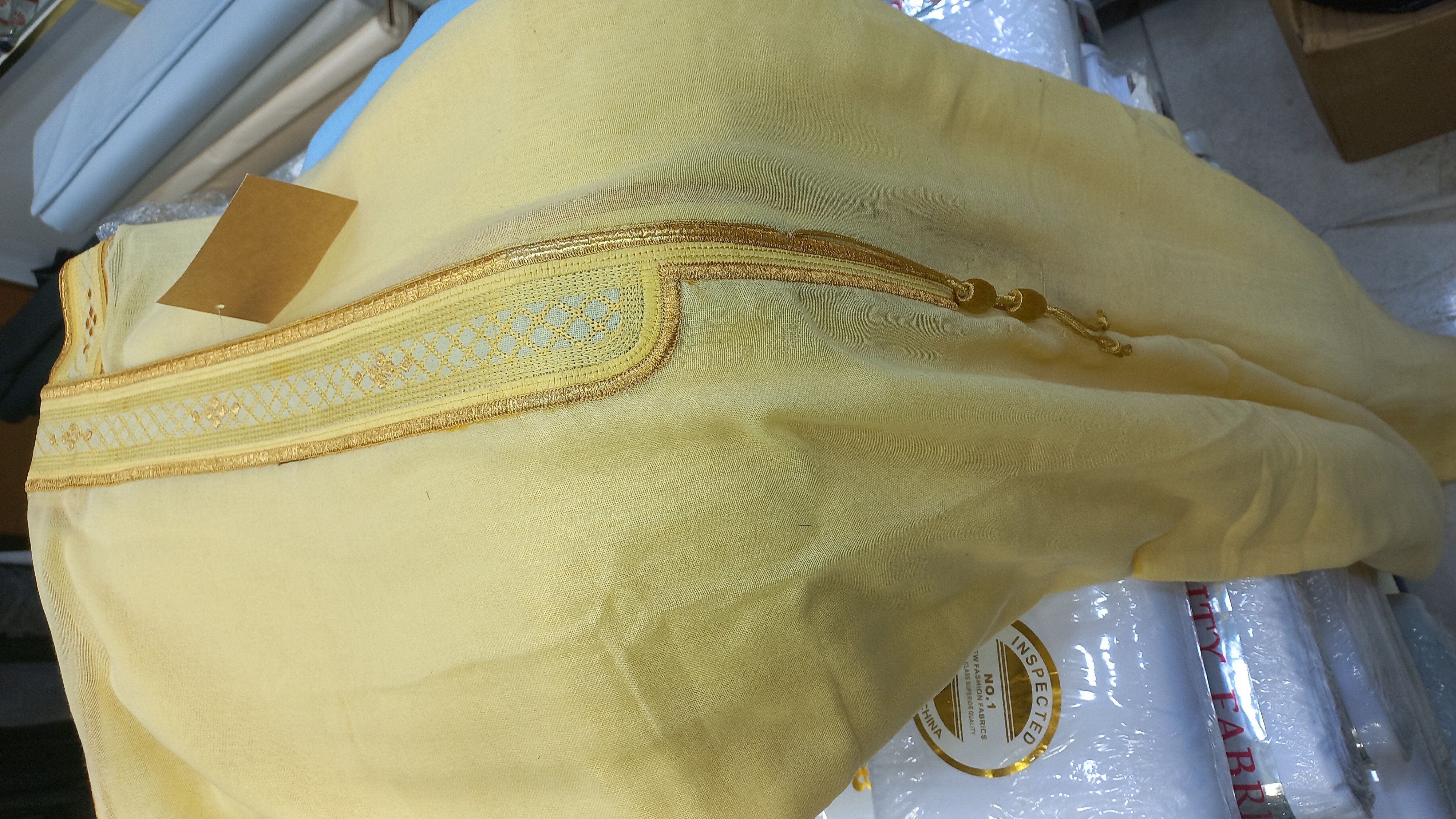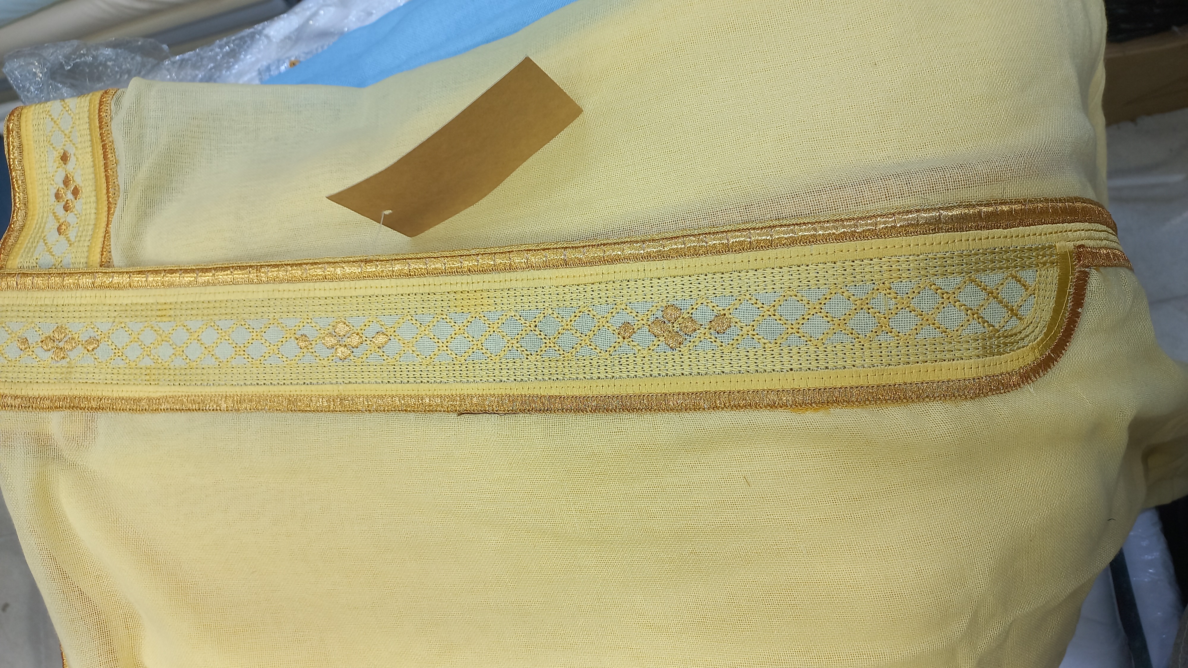 - گلدوزیهای هندسی با نخهای طلایی و نقرهای، در امتداد لبهها، یادآور هنر مضیف عربی و شکوه معماری اسلامی است—ترکیبی از سنت و تجمل.