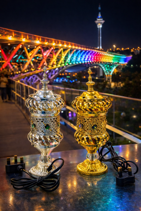 بخورسوز برقی نقره ایی ترکیبی از طراحی هنری و جلال عربی–خلیجی است؛ ساخته شده برای خانههایی که زیبایی را نه در جزئیات، بلکه در جزئیاتِ لوکس میبینند.